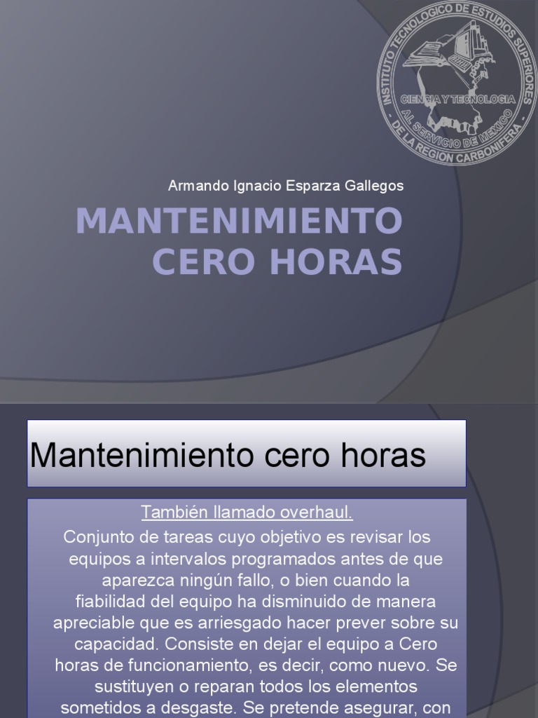 Mantenimiento Cero Horas from demo.dokumen.tips El mantenimiento cero horas suele relacionarse con la reparación inmediata luego de haberse detectado una falla técnica, pero esta no es la única forma de entender el overhauling. Es el conjunto de tareas cuyo objetivo es revisar los equipos a intervalos programados bien antes de que aparezca dicha revisión consiste en dejar el equipo a cero horas de funcionamiento, es decir, como si el equipo fuera nuevo. <b> es el conjunto de tareas cuyo objetivo es revisar. Mantenimiento cero horas (overhaul), sistemático o hard time (m.h.t.) otro de los mantenimientos radicales es el mantenimiento overhaul que es el conjunto de tareas cuyo objetivo es revisar los equipos a intervalos programados bien antes de que aparezca ningún fallo, bien. El overhaul especial o detallado se lleva a cabo considerando todas las piezas del motor, tales como los pistones, lo que implica desarmarlo por completo y luego volverlo a ensamblar. Mantenimiento si realizar la reparación al motor o al generador u ambos. Este último procedimiento, si es ejecutado de manera correcta, deja al motor como recién salido de fábrica. Es el conjunto de tareas cuyo objetivo es revisar los equipos a intervalos programados bien antes de que aparezca ningún fallo dicha revisión consiste en dejar el equipo a cero horas de funcionamiento, es decir, como si el equipo fuera nuevo.